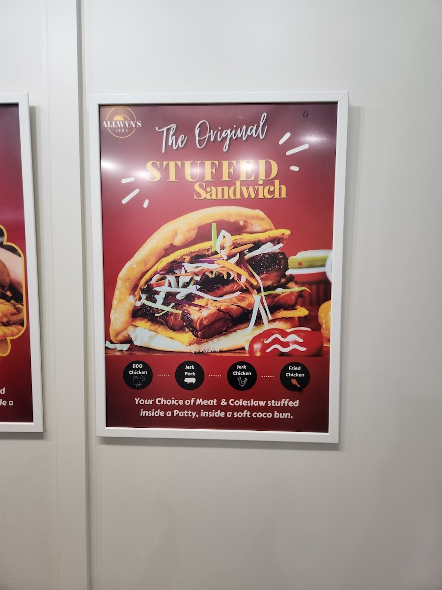 Jerk Chicken or Jerk Pork with lettuce, tomatoes, allwyn's jerk sauce, seasonings and mayo wrapped inside a warm coco bun